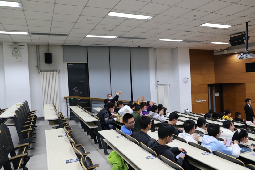 二轮比赛后,进入到了“你问我答”环节,由分数较低的班级向其他班级提问。比赛题目涉及范围十分广泛,对选手的策略安排和知识面是个很大的挑战。场上同学谨慎地选择题目类型和题目,用刁钻的题目来考验对手。场下的其他选手也进入了状态,紧张地安排着本组的选人和选题策略。