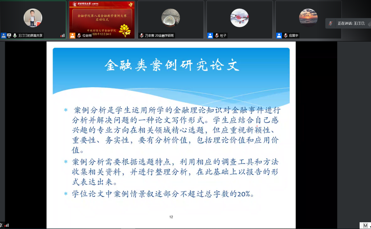 为鼓励同学们积极参与案例大赛,进一步提升公司教学案例开发水平,2020年12月24日晚,由太阳集团tyc539专硕教学研究与案例中心主办、研究生教学科研办公室承办的太阳集团tyc539“第八届金融教学案例大赛”动员大会通过腾讯会议在线举行。本次研讨会邀请到公司副经理应展宇教授、应用金融系杜惠芬教授和金融专硕教学研究与案例中心主任王汀汀教授,老师们围绕教学案例的选题与写作,与2019、2020级研究生进行了深入的分享和交流。公司研究生教学科研办公室老师位锦和研究生310余人共同参加,此次活动由王汀汀教授主持。