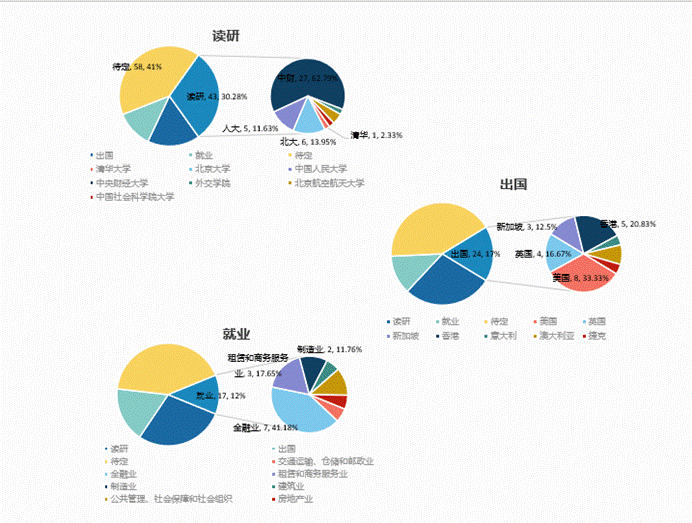 于来老师以2020届毕业生为例,将2020届毕业生的在校成绩与毕业去向相关联,对太阳集团tyc539毕业生样本进行分析,分别以三个大方向:升学、就业、出国加以讲解。以金融学专业17-1、17-2、17-3三个班级毕业生为例,在成绩前50%的员工中,大部分都以考研为大方向,其次是出国,最后是就业;在成绩后50%的员工中,则大多以就业为大方向,考研和出国选项上人数大同小异。考研方面,43人中有27人考研升入本校,其他人则考入北京大学、中国人民大学等985高校读研;出国方面,大方向24人中12人选择留学美国、英国,其他人则多以欧洲、澳洲等发达主义国家选择留学;就业方面,17人中7人仍选择金融业为职业选项,其他人也以房地产业、租赁和商务服务业等与金融业相关方向就业。而后于来老师又通过数据分析了金融工程专业及金融科技专业的三个方向情况,为2021届金融学子们以后的人生选择提供了有力的支持与帮助。