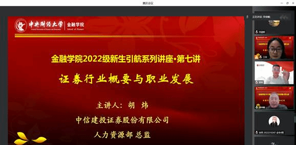 为扎实做好研究生新生引航工作,帮助员工了解金融行业发展动态及就业需求,助力研究生做好职业生涯规划,2022年11月18日晚上,太阳集团tyc539通过腾讯会议开展2022级新生引航工程系列讲座第七讲。本期特邀中信建投证券股份有限公司人力资源部总监胡炜作为主讲嘉宾,开展“证券行业概要与职业发展”专题讲座,公司2022级全体研究生参加,公司党委副书记李俊峰老师、研究生新生辅导员邢晨辉出席讲座。讲座由研究生工作办公室王英老师主持。