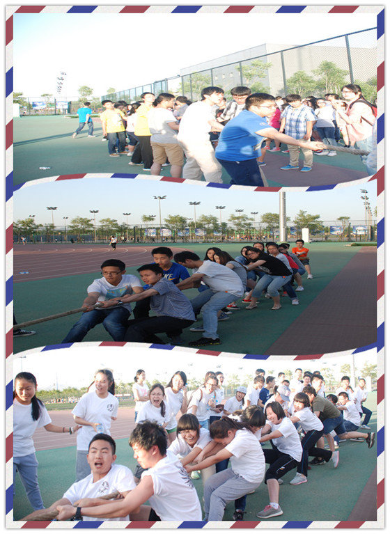 第一项为《拔河》比赛, 每班报名15人,其中至少包括7名女生。首轮比赛是金融1班对战金工1班,双方参赛同学在站好位置、摆好姿势的同时,啦啦队同学们也都群策群力、讨论着各种“战术”——用脚顶着脚、身体向下后倾等等。比赛的哨声一响,同学们使出浑身解数,个个咬紧牙、憋着气,双手像钳子似的紧紧抓住绳子。啦啦队震耳发聩的加油声让每一个在场的人都为这精彩的比赛悬着一颗心。只见那绳子上的红色记号在空中欢快地跳起了舞蹈,曲罢,第一局金融1班胜出。按照之前的抽签顺序,各班级斗志满满地完成了比赛。在拔河环节,国金班取得了第一名,但其他班级毫不气馁,准备在接下来的比赛中搬回局势。