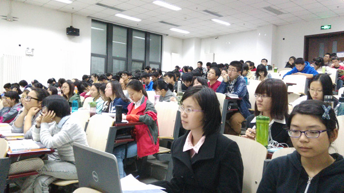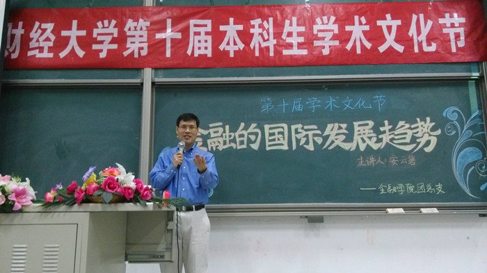 晚上7点,讲座正式开始,安云碧教授就“金融学与金融工程未来国际发展趋势”这一主题进行分析。他首先对国内外金融学的侧重方面做了深入比较,进而提出了自己对金融国际发展趋势的独到见解。他认为国内的金融领域主要专注于宏观金融,而国外则侧重于对微观领域的研究。目前金融学的发展趋势正是从宏观逐渐走向微观。国内研究微观金融的人才还较为稀缺。然后,安云碧教授为同学们解释了有效市场的相关概念,简单介绍了资产定价和金融理论分析,使同学们对金融有了初步理解。他还列举了诺贝尔经济学奖获得者的主要理论与贡献,阐释了金融研究的两个重要方法,即理论研究和实证研究,鼓励同学们更加深入地学习金融知识,解决目前金融领域存在的问题。安碧云教授丰富的专业知识和精彩的讲授过程感染了在座的每位同学,大家都融入到现场浓厚的学术氛围中去。