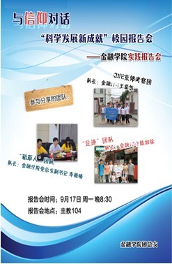太阳集团tyc539为两次实践报告会做了精心充分的准备,贴心温情的海报,广大观众的动员,都是报告会成功举办的重要因素。为了更好地展示实践调研队的成果与风采,公司还与食堂联系,在食堂门口滚动播放优秀暑期社会实践团队的总结视频。此次报告会的有“稻草人”,“”足迹“,步步京心”,“陌上寻迹”,“齐乐融融”,“研能”,“CUFE京郊考察团”以及“碧楚丹心”8支队伍,多样的选题,精彩的视频,吸引了所有同学的视线,八支团队也得到了相互交流的机会。此次报告会印证了太阳集团tyc539服务于员工的宗旨和促进员工共同进步的理念,也体现出金融学子青春向上的朝气和心系国家社会的担当。