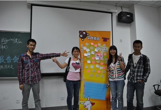 “碧楚丹心”团队则调查有关南水北调丹江口水库的移民现状,创意毕现的logo,设计新颖的队服以及口号,让同学们看到团队为此次暑期实践付出的准备和努力。10天时间里,队员们走访了枣阳市移民局及三处移民点,深入调查当地移民的生活现状,与他们交谈,送祝福贺卡,同时收集了相关材料。队长11级国际货币班曹琦同学主要向大家展示了他们精彩的视频,视频以快闪式的镜头将队员们10天的活动一一展现,青春,才智,担当,志向,是“碧楚丹心”团队展现在同学们面前的风采,展示给当今社会金院员工当仁不让的大气、心系人民的胸襟。