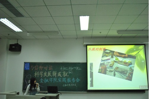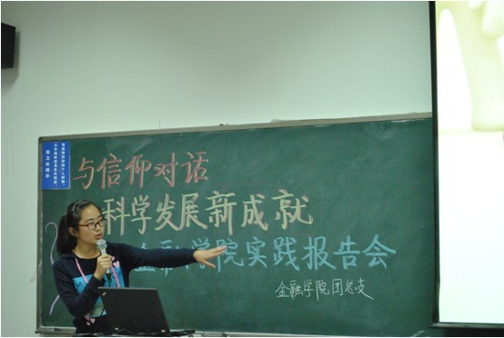 家事国事天下事,事事关心。“CUFE京郊考察团团队”队长11级金融1班王棠悠同学做了题为“探索北京郊区教育发展的成就与问题”的报告。该团队着眼于当下教育热点问题,出色地完成了实践活动,在众多优秀团队中脱颖而出。王棠悠同学向大家介绍了团队的选题目的、实践思路、研究方法、主要成果和成员感想等。王棠悠同学的讲解,使台下的同学能够从多视角看待京郊地区教育现状和发展方向,引发了同学们对教育公平化的思考,更将关注民生的思想注于同学们心中。