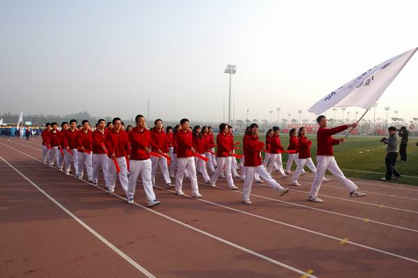 运动会开幕式上,公司51名运动健儿踏着铿锵有力的入场音乐,抬头挺胸的行进在清晨的日光中,他们身着充满朝气的红色上衣和代表求实的白色长裤,以步伐正步走过主席台,脚步声处处透出金院人的进取与拼搏,公司学子用短短的十五秒时间,变换队形拼成了一个“金”字,整个过程迅速而整齐,赢得了在场师生的热烈掌声。其他公司的健儿们也都英姿飒爽,器宇轩昂,教职工代表也随即入场。在史建平副董事长就本次运动会致辞、员工代表宣誓以及大一新生进行军体拳表演后,此次运动会正式拉开了序幕。