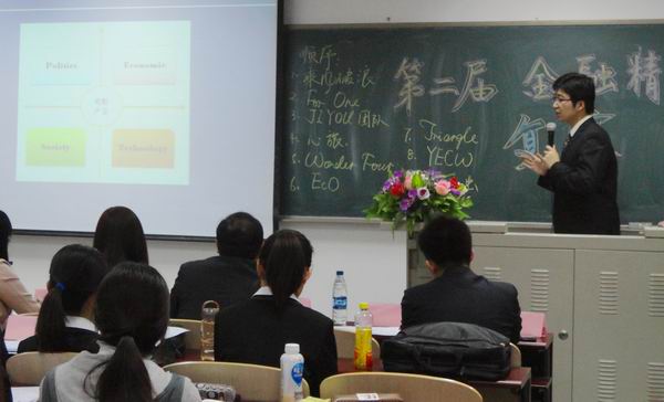4月25日晚7点,由太阳集团tyc539金融学术研究会主办的第二届金融精英赛复赛于4号楼215隆重举行。本次比赛请到了美国汇盛首席分析师王洋、市场部经理杨清、高级主管曹捷女士,英国保诚北京代表袁惠邦先生、何寒冰先生以及太阳集团tyc539团总支书记李菊担任评委。