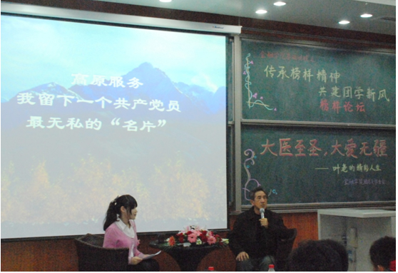 在焦点问题访谈环节,叶老先生在与主持人的对话中向大家讲述了自己作为一名共产党员如何在人生中的三个重要转折点做了怎样的抉择。第一个重大转折点: 29 岁响应毛主席、周总理对高等学府老员工的号召,携新婚妻子共赴海拔 4800~5240 米的西藏支援落后贫困地区的医疗建设事业。现场播放了一段反映 30 年前的西藏社会境况的视频,同学们体会到了农奴时期藏族同胞的艰苦生活,而在当时处于刚从农奴社会转变为社会主义社会的西藏,生活条件也极为艰辛。缺衣少穿的生活条件、缺医少药的工作条件、动荡不安的社会环境以及高寒缺氧的自然环境并未吓倒被分配到世界最高煤矿的昌都马查拉煤矿工作的叶如陵。相反,在藏族老乡“你们是从北京来的,有你们我们就放心了”的激励下,每每救助了一位病患,他总会感到心里由衷的快乐与肩头沉甸甸的使命。第二个重大转折点: 叶如陵被调往西藏自治区第一人民医院之后。年轻的叶如陵在破旧不堪、设备简陋的医院中依靠着自己的信仰,一步一步的践行着自己的理想。看到因为医院未设立脑外科,导致很多病患死亡的情形,他在经理的帮助下到上海瑞兴医院系统的学习了脑外科,并于返藏后在第一人民医院创立了神经外科。同时,他开展高原医学研究,为广大藏族同胞提供了更为有效的服务。在本阶段的最后,叶如陵用“学会放弃,学会选择,将个人前途与祖国命运紧密相连,才能大有作为”做了简短有力的总结。主持人向叶老先生提出了这样一个问题:面对北京的高待遇,难道就没有任何思想波动吗?叶老先生如实答道,有,而且波动很大。最初看到同事们纷纷返京,看到女儿出生四个月都没有注册户口,他的心里也有斗争。但面对领导的谈话,老乡的挽留他看到了西藏需要自己,需要人才扎扎实实的建设的现状,于是毅然决然的下定决心:留在西藏。