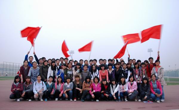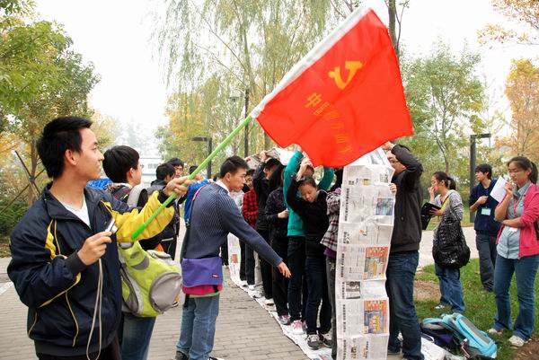 弥谩瘴雾何所惧,北上抗日志更坚,“坐地起”,怎奈何我金融学子,一蹴而就迎胜利。人语马啸西风劲,露洗湿衣成冰瓜,“绑腿跑”,纵使秋风瑟瑟起,满怀激情,号声嘹亮,手挽手,心齐心。在历时一个多小时后,“长征队伍”迎来了他们倒数第二个任务---翻报纸。这不仅要求同学间要有极高的默契,而且考验了同学们的智慧。同学们集思广益,纷纷开动脑筋,在不断地尝试后,终于找到了完成任务的诀窍。长征路逐渐接近了尾声,回到足球场上,辛苦的战士们面临着他们的最后一项任务---解手链。大家协力齐心,以完美的结局为整个“长征路”画上了句号。