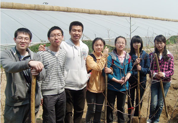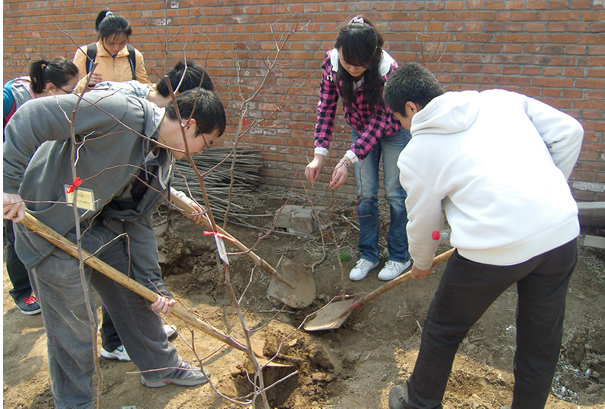 上午 9 点半同学们抵达赵各庄,先向工作人员详细了解植树步骤后便 开始行动。大家认真地挖树坑,担水,栽树,浇水。看着那些寄给予了大家感恩、祝福与希望的小树苗,大家脸上也都露出了欣慰而幸福的笑容。同学们通过劳动,实践了植树的知识,也为周围环境增添了一抹绿色。