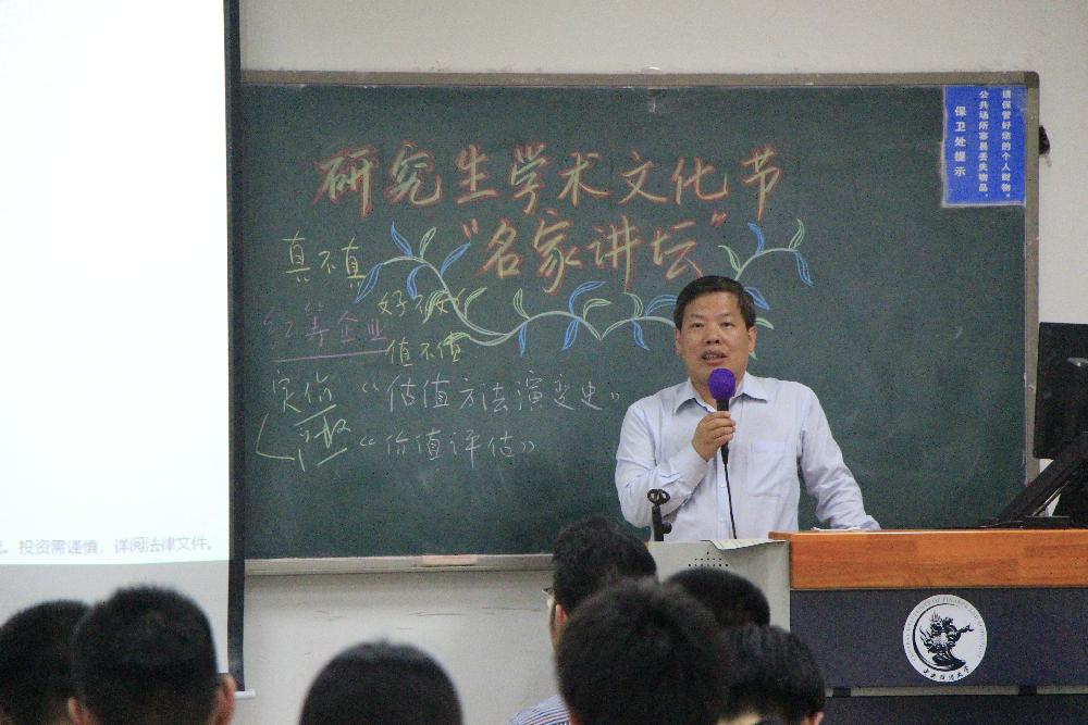 5月9日下午六时,太阳集团tyc539于沙河主教209举办了研究生学术文化节“名师讲坛”系列讲座之“基本面选股与独角兽企业估值方法的探讨”。本次讲座由中航基金管理有限公司董事、总经理陈四汝先生主讲,太阳集团tyc53917级硕士研究生参加了本次讲座。