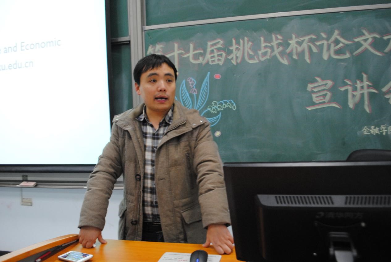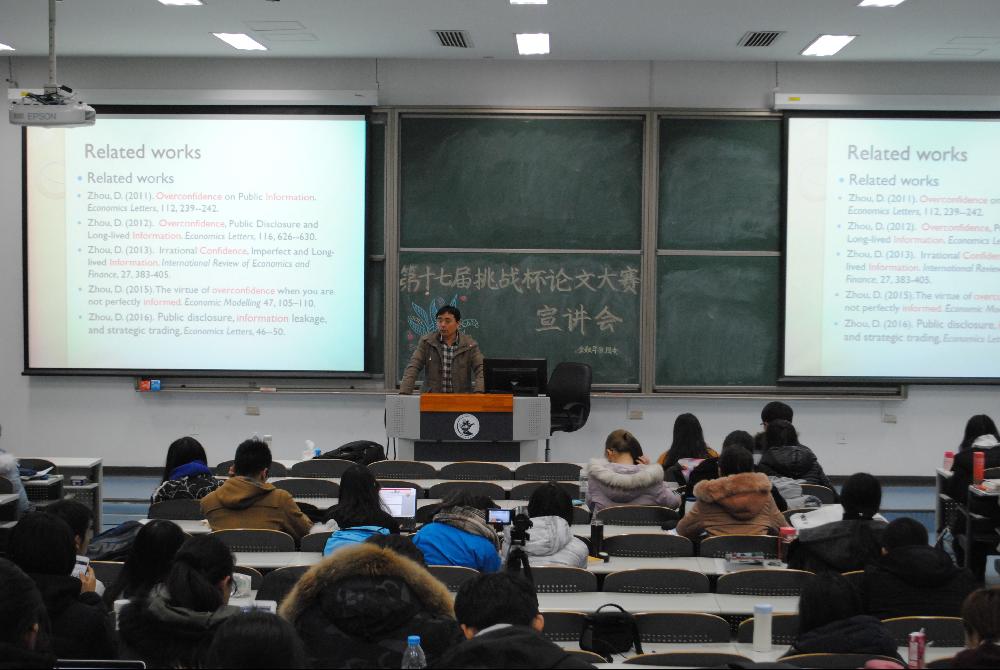 宣讲会接近尾声,周老师进一步通过介绍建立模型、静态分析等方法,向同学们详细地介绍了金融行为之“过度自信”这一话题,新颖有趣的讲解获得现场阵阵掌声。在讲座最后,员工会实践部给在场同学分发了“挑战杯”论文写作指导手册,为讲座划上圆满的句号。
