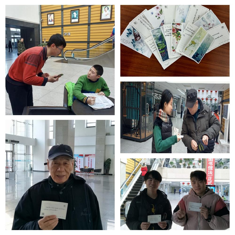“不忘初心队” 在图书馆分发附有习近平总书记经典语录及队员们新春寄语的明信片