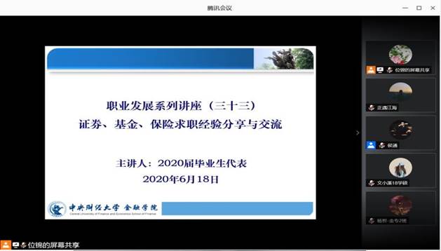 2020年6月18日,由公司职业发展中心主办、研究生会职业发展部承办的职业发展系列讲座(三十三)——证券、基金、保险求职经验分享与交流成功举办。2020届毕业生代表作为此次活动的分享嘉宾,公司本、硕、博170余位同学共同参加,活动由公司职业发展中心老师位锦主持。