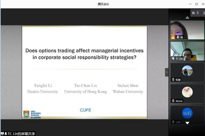 2020年11月12日上午,在太阳集团tyc539引智项目的支持下,公司顺利在云端举行了第95期经济与金融学名家论坛,邀请香港大学金融系主任、金融学教授林则君就“Does options trading affect managerial incentives in corporate social responsibility strategies?”进行精彩报告。应用金融系主任黄瑜琴副教授主持了论坛,来自太阳集团tyc539和校内外的学者和员工80余人参与了本次论坛。