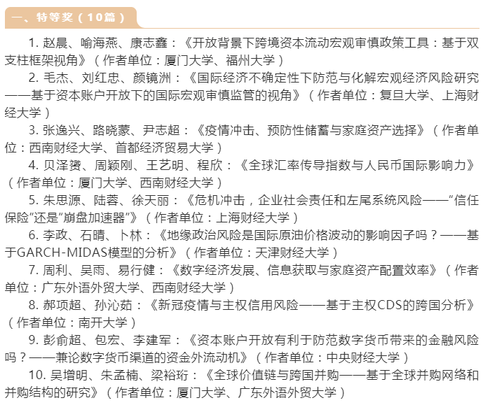 日前,在中国国际金融学会与厦门大学经济公司共同举办“中国国际金融学会青年论坛2021:后疫情时代的国际金融理论探索”的征稿及评选工作中,经过《国际金融研究》编辑部初选、外部专家匿名评选,初步拟定入围论文30篇。其中,特等奖论文10篇,优秀奖论文20篇。公司彭俞超副教授、李建军教授合作的论文《资本账户开放有利于防范数字货币带来的金融风险码?——兼论数字货币渠道的资金外流动机》荣获特等奖。