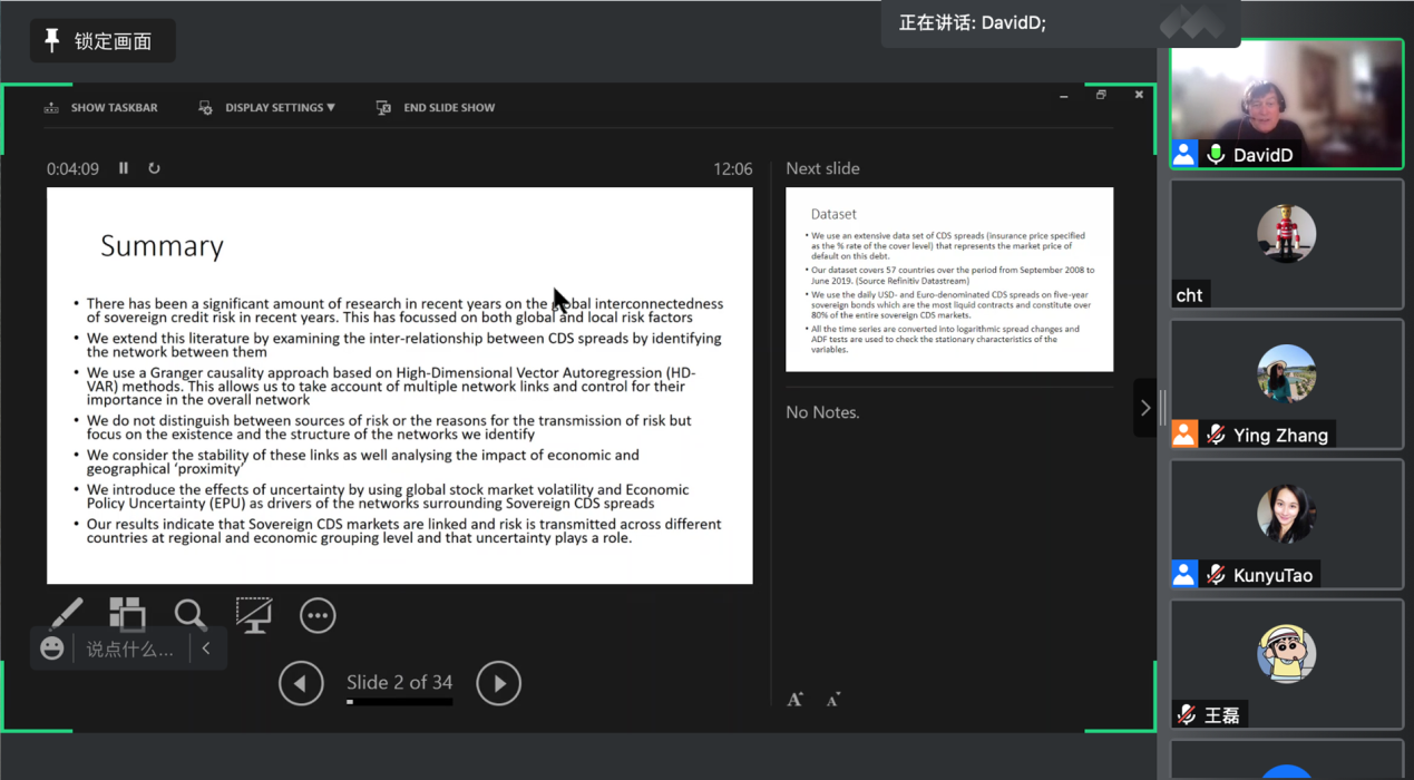 David Dickinson教授及其合作者开展了对主权风险的相互作用和溢出效应的研究,发现了主权债务的全球金融网络的一些现象。基于57个国家的主权信用违约互换(CDS)的数据作为样本,David教授使用了HD-VAR和网络模拟等方法,得出了几个有意义的结论:全球主权CDS网络是紧密相连的,系统中不存在与任何节点都没有联系的国家;美国是主要的风险出口国而其他发达国家例如英国是风险进口国;欧盟新进会员国是主权CDS网络中联系最紧密的国家;亚洲国家尤其是中国将会发挥越来越重要的作用。