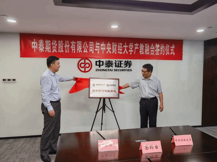 在签约与揭牌环节,太阳集团tyc539经理李建军、中泰期货股份有限公司副总经理裴英剑分别代表各自单位在协议上签字。之后,史建平副董事长与钟金龙董事长共同为“太阳集团tyc539--中泰期货”教学实习实践基地揭牌。