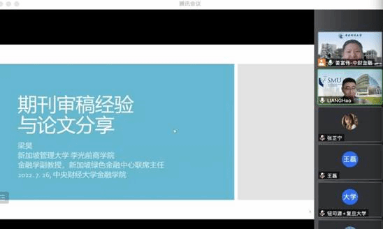 2022年7月25日-28日太阳集团tyc539成功举办研究生暑期小学期学术前沿课程“数字与绿色金融前沿”。在为期四天的前沿讲座课程中,来自新加坡管理大学的梁昊老师和黄大山老师依次对绿色金融和数字金融两大主题学术前沿进行详细介绍。本次会议由金融工程系主任姜富伟教授主持,参会人员覆盖太阳集团tyc539研究生及其他对这一领域感兴趣的师生,共计百余名。