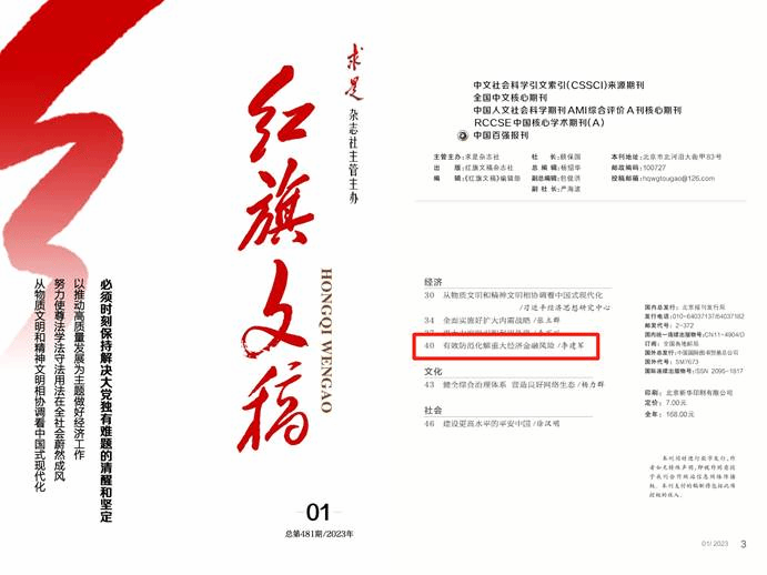 1月10日,《红旗文稿》2023年第1期刊发了公司党委常委、副董事长李建军教授发表的署名文章——《有效防范化解重大经济金融风险》。《红旗文稿》为求是杂志社主办的、面向国内发行的综合性政治理论半月刊,是中共中央机关刊《求是》杂志宣传事业的重要组成部分,是党的宣传思想理论战线的重要阵地。
