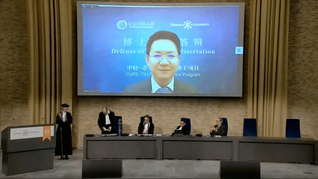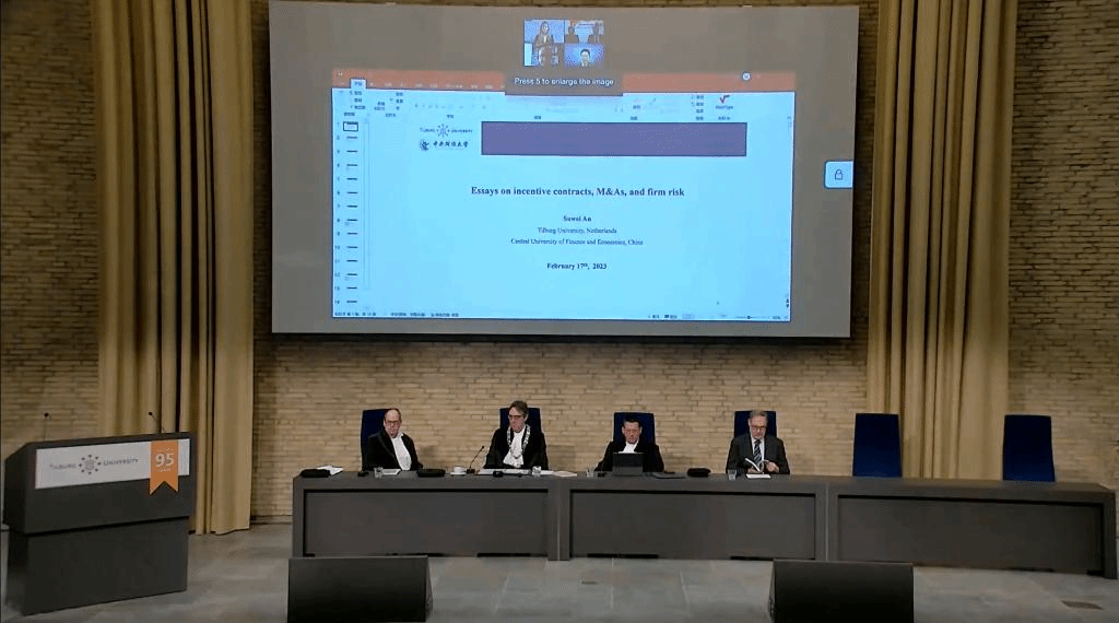 2023年2月17日,中财-蒂尔堡项目博士生学位论文公开答辩仪式在蒂尔堡大学Aula大礼堂举行。公司蒂尔堡项目2018级博士生安苏伟在线进行了公开答辩,其导师荷兰蒂尔堡大学Lieven Baele教授、谭小芬教授、吴锴副教授,以及博士委员会成员安特卫普大学Marc Deloof教授、马斯特里赫特大学Rachel Pownall教授、蒂尔堡大学Frans de Roon教授和Peter de Goeij副教授均参加了答辩仪式。