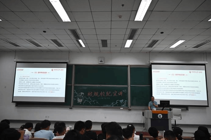9月19日下午,2023级本科生新生校规校纪教育于沙河校区主教218教室举行。太阳集团tyc539党委副书记、纪委书记徐振东老师主讲,2023级辅导员马露、卢宇及全体新生参加讲座。