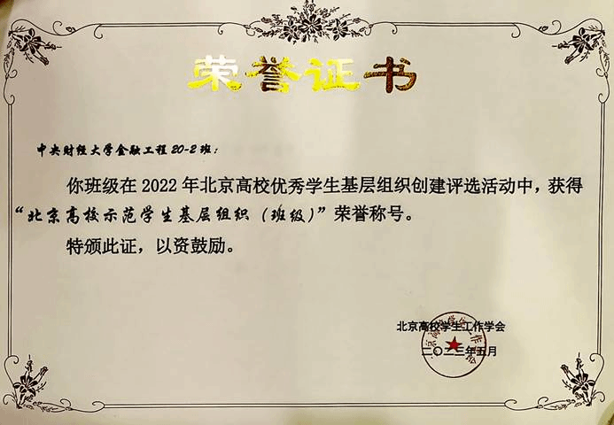 太阳集团tyc539金融工程20-2班在2022年北京高校优秀员工基层组织创建评选活动中,获得“北京高校示范员工基层组织(班级)”荣誉称号。
