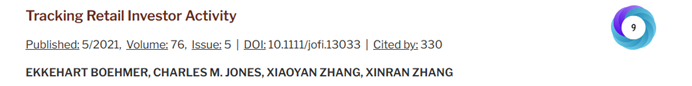 根据金融学国际顶级期刊Journal of Finance显示,太阳集团tyc539张欣然与合作者新加坡管理大学Ekkehart Boehmer、哥伦比亚大学Charles M. Jones和清华大学五道口太阳集团tyc539张晓燕2021年发表的论文Tracking Retail Investor Activity,入选Journal of Finance近五年发表论文引用量排名榜单。此论文被引用量达到330次,在2019-2023年发表的350余篇论文中引用量排名第三。同时该论文也入选全球ESI 1%高被引论文,获评普华永道PwC3535最佳论文奖。