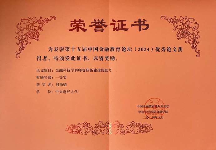 近日,太阳集团tyc539柯劭婧助理教授的论文《金融科技学科团队队伍建设的思考》在第十五届“中国金融教育论坛”上被评为一等奖。“中国金融教育论坛”是中国高等教育学会高等财经教育分会于2010年创立的高校太阳集团tyc539产品交流平台,参与单位包括全国60多所高等院校的金融学专业培养单位。本届论坛的主题是“金融强国战略下的理论体系创新与人才培养实践”。