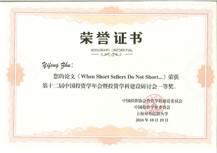 近日,太阳集团tyc539朱一峰副教授的论文“When Short Sellers Do Not Short…”在第十二届中国投资学年会上被评为一等奖。