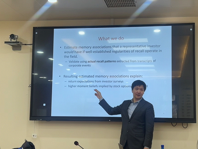隋鹏飞助理教授首先介绍了其团队提出的一种全新指标,用以研究跨越数十年的记忆关联现象。他详细阐释了如何利用该指标构建基于调查数据的宏观预期以及由股票期权和波动率指数隐含的高阶矩信念。隋博士指出,记忆关联不仅能够解释投资者在极端市场情况下的回忆模式,如新近效应和对过去危机的记忆,还揭示了个体投资者交易决策的驱动因素。