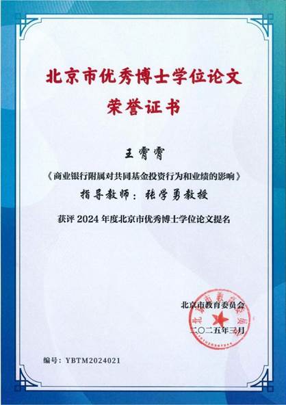 近日,北京市教育委员会、北京市学位委员会公布了2024年北京市优秀博士学位论文名单,公司张学勇教授指导的博士生王霄霄撰写的博士学位论文《商业银行附属对共同基金投资行为和业绩的影响》,荣获北京市优秀博士学位论文提名奖。2024年北京市优秀博士学位论文评选推荐工作评选范围为2023年1月1日至2023年12月31日获得博士学位者的学位论文,共评出优秀博士学位论文90篇,优秀博士学位论文提名32篇。