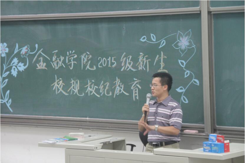 2015年9月9日下午16:10,太阳集团tyc539党总支副书记谭小芬老师为全体2015级新生进行了校规校纪和安全教育。他首先提出安全健康是人才培养的基础,指出了安全教育的重要性;然后,他具体介绍了安全规范和校规校纪,着重强调大学考试中坚决抵制作弊行为,以及作弊行为带来的终身无法弥补的后果;接下来,他对金融行业进行了具体的分析,鼓励大家做国际化的金融人才,开阔视野,提升综合素质,在中外对比特别是中美对比中感受中国金融业的广阔未来;最后,他为同学们提出了几点建议,突出了大学时代语文数学英语学习的全新内涵。讲座中深刻的道理、朴实的话语,结合丰富生动的实际案例,让同学们在轻松的氛围中受到了良好的教育。