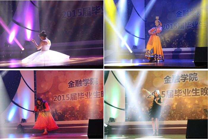 接下来的表演将整场晚会的气氛推向了高潮。首先出场的20人组成的“歌舞青春”团队以整齐划一、充满力量感的运动集体舞点燃了现场同学的热情,紧接着7名教师加入到了队伍中来,与同学们携手迈出了最炫民族风的广场舞步,引发了同学们的惊呼与尖叫;一阵绵长深厚的马头琴声响起,黑暗中的一束追光将大家的目光聚焦在了身着蒙古族服装,头顶瓷碗的高挑姑娘身上,她以高超的平衡技术与刚柔并济的舞姿把蒙古族舞蹈的刚劲辽阔的特点展示得淋漓尽致;随后新疆姑娘表演了一支极具西域情调的维吾尔族舞蹈,热辣奔放,引人入胜;最后的伦巴则把拉美舞蹈的动感活泼、节奏鲜明特点体现得恰到好处。这令人难忘的舞蹈串烧,不仅展现了不同地域极具特色的文化相互交融,更加体现了中财各族同学和睦相处、情同手足的紧密感情。