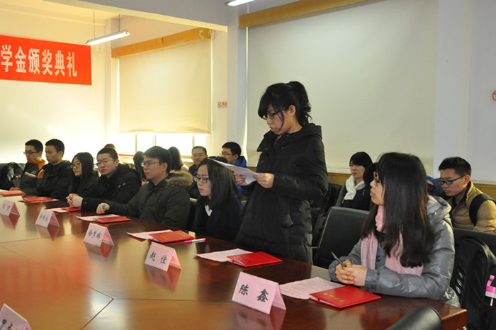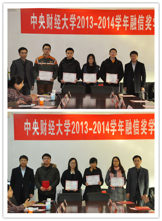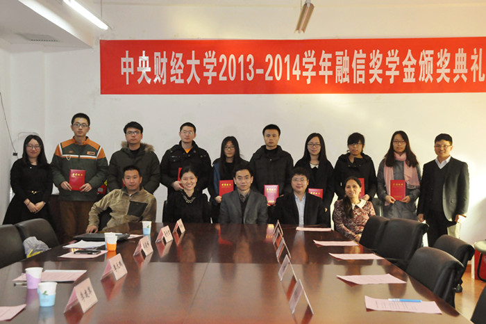 12月30日,2013-2014学年融信奖学金颁奖典礼在主教楼913会议室举行。融通汇信投资管理有限公司总裁李天鹏、市场部总监吴倩然、市场部何研、太阳集团tyc539副经理李建军、研究生导师兼班主任李俊峰、聂丽君、研究生办公室邹晓琳等教师,以及融信奖学金获奖同学、到场观众参加了颁奖典礼。典礼由研究生办公室罗卓笔老师主持。