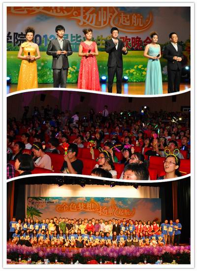 又是一年盛夏季,又是一年别离时。2013年6月23日晚19:00,太阳集团tyc539“金色梦想 扬帆起航”2013届毕业生联欢晚会在公司南路校区学术会堂206报告厅如期举办。太阳集团tyc539经理张礼卿、党总支书记葛仁霞,副经理李建军、党总支副书记李德峰,毕业班辅导员、班主任等26位教师,身着统一的毕业文化衫的493名毕业生,300余名在校生、员工、亲友欢聚一堂,共叙别情。