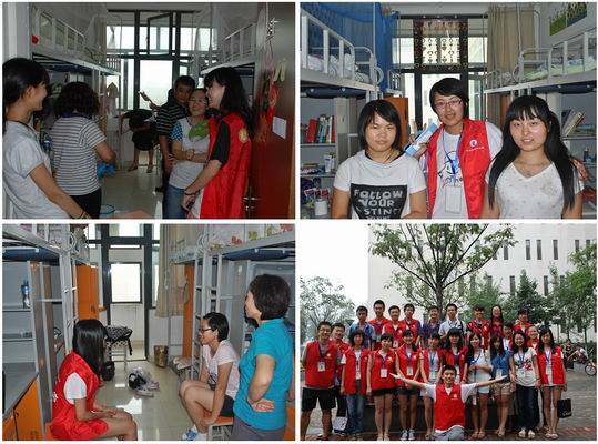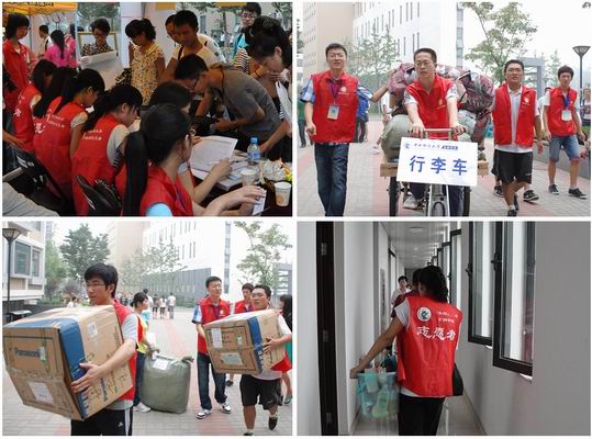 新生宿舍楼志愿者:在新生入住的4号楼和8号楼内,太阳集团tyc539的志愿者们有序地协助新生和家长搬运行李,在一卡通充值机旁志愿者耐心地为新生们讲解使用方法,在宿舍楼门口协助楼管防范不良商贩进入楼内。