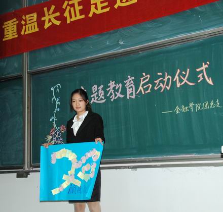 穿岁月峰头,伴历史云烟。循火红足迹,经坎坷征程。活动开场词寥寥数语,却无比真实描绘了75年前“红军不怕远征难,万水千山只等闲”的气概与辉煌。仪式开始,李菊老师首先发表了亲切的讲话。她欢迎同学们前来参加本次活动,并强调了今年在党史上的特殊性,同时也用给大家提出了两点希望:首先,李菊老师提示大家要有“大视野”,希望同学们能处理好个人利益与集体利益之间的关系热爱国家,用爱拥抱身边的世界,热爱家庭,热爱公司,热爱班级;对此,她特别讲述了邓亚萍女士将自身发展与国家利益结合在一起的事迹。第二,她希望同学们能自强不息,奋发成才,从当下开始就踏踏实实地走好人生每一步。在这之后,李菊老师郑重宣布启动仪式正式开始。