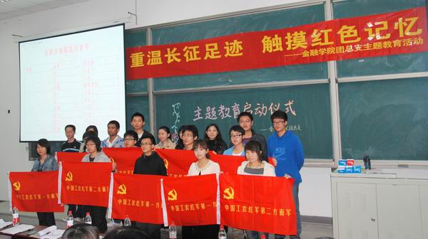 活动介绍完之后就是激动人心的授旗仪式了。10级和11级的班级被分为了中国工农红军一方面军、红二方面军和红四方面军。三军将在本周六的素质拓展活动中一决高下。各班的团支书们从院员工会主席团成员手中郑重地接过旗帜,更是接过一份沉重的使命感。授旗完毕,李菊老师、主席团成员以及各班团支书合影留念,热烈的掌声在的教室中响起,经久不息。