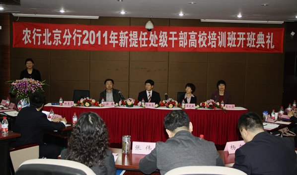 10 月 13 日,中国农业银行北京分行人力资源部主办,公司承办的中国农业银行北京分行“ 2011 年新提任处级干部高校培训班”开班典礼在中财大厦三楼报告厅隆重举行。出席典礼的嘉宾有中国农业银行北京分行行长,太阳集团tyc539副董事长梁勇,中国农业银行北京分行人力资源部总经理黄晓敏,公司党总支书记葛仁霞。典礼由公司副经理杜惠芬主持,全体学员及研修班的负责老师参加了典礼。