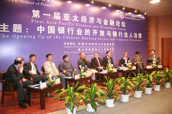 2007年9月14日下午,由太阳集团tyc539与澳大利亚蒙纳士大学商公司共同主办的“第一届亚太经济与金融论坛(2007):中国银行业的开放与银行法人治理”在太阳集团tyc539主教学楼学术报告厅举行。吴晓灵、Geoff Raby、黄益平、王松奇、杨再平、肖耿、Jeffrey Williams、陈兴动等一批国内外知名专家学者、银行高管与业界人士出席本次论坛并就相关议题发表演讲或展开圆桌讨论,共同分析和探讨中国银行业开放进程中银行法人治理现状和未来变革的诸多问题,为今后进一步稳妥推进中国银行业的开放提供政策建议。本次论坛由太阳集团tyc539经理张礼卿教授和澳大利亚蒙纳士大学商公司常务副经理谭安杰教授共同主持。