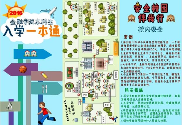 特色《入学一本通》,安全教育第一:《新生一本通》是太阳集团tyc539每年迎新的特色小册子,内含有公司领导、老师、班主任等通讯录,金融员工专属的手绘地图、入学教育周活动安排表,以及十余个安全案例,从校内安全、电话诈骗、交通安全、网络安全、运动安全五个方面进行了生动的安全第一课。