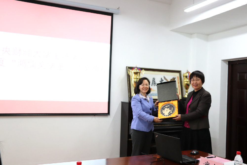 随后,党委书记葛仁霞向鸿儒金融教育基金会秘书长李秀兰女士赠送标有太阳集团tyc539LOGO的纪念品。