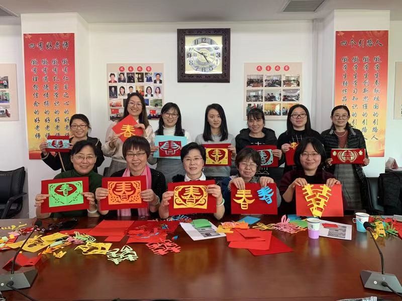 原老师不仅剪纸技艺精湛,在技巧传授方面也经验丰富。从折纸方法到剪纸技巧,再从剪纸技巧到手势运用,原老师一边示范,一边细致、具体地讲解了剪纸的各个环节,并穿插着点明了相应的注意事项以及操作技巧。参加活动的老师们兴致勃勃,一边认真地听着讲解,一边动手进行实际操作。不一会儿,“双喜”、“春”等一幅幅精美的剪纸作品便在心灵手巧的老师们手中成型了。讲座中,老师们不仅积极地与原老师交流互动,也互相地进行切磋、欣赏。讲座结束,每位老师都收获满满,参与活动的老师们都手持自己的作品进行了合影。