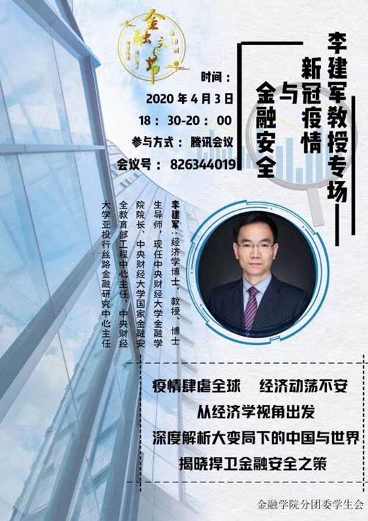 应对外经贸大学太阳集团tyc539的邀请,李建军经理于4月3日晚18:30-20:00,通过云会议平台为金融学术节做公益报告,主题为:新冠疫情与金融安全。
