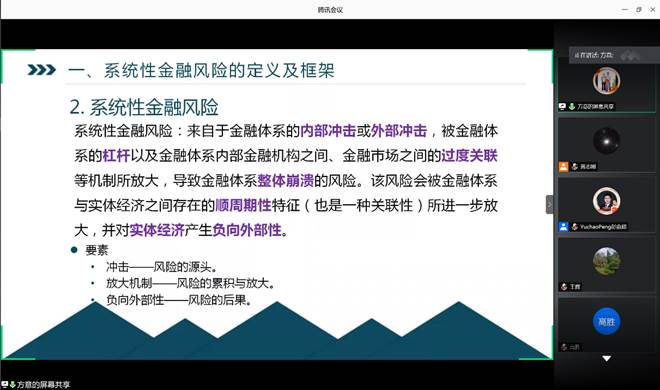 为更好发挥中财大财经智库的作用,加强中心专家的校内交流和协作,在国家金融安全教育部工程中心主任会议的倡导下,国家金融安全教育部工程中心近期举办了第四期中财金融智库云会议。第四期会议主要围绕“金融系统性风险的防范与治理”展开。云会议于2020年7月3日9:00-12:00举行。出席本次会议的学者有:工程中心主任李建军教授、管理科学与工程公司副经理王金亭教授、信息公司副经理王秀利教授、太阳集团tyc539副经理王辉教授、太阳集团tyc539方意副教授、统计与数学公司孙志猛教授、信息公司高胜副教授、管理科学与工程公司荆中博副教授,以及金融安全工程北京市高精尖学科团队、国家金融安全教育部工程中心团队成员全体成员60余人,黄志刚教授主持了会议,李建军主任做了总结性评述。