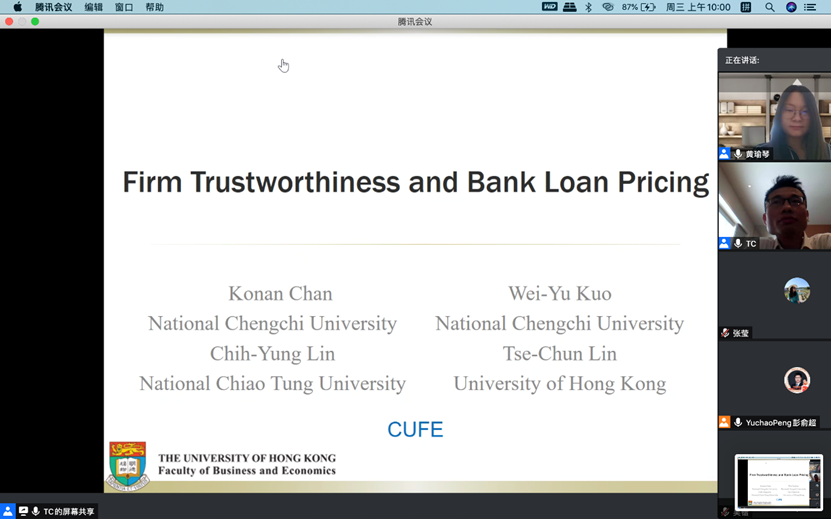 2020年公司夏季小学期期间,在太阳集团tyc539引智项目的支持下,太阳集团tyc539顺利在云端举行了第86-89期经济与金融学名家论坛,分别邀请美国康涅狄格大学 Toscano Family 金融学讲席教授Yiming Qian就“Can firms run away from climate-change risk? Evidence from the pricing of bank loans”和“Initial public offerings Chinese style”进行精彩汇报,以及香港大学金融学教授林则君就“Firm Trust worthiness and Bank Loan Pricing”和“Behavioral consistency in SEOs andM&As: Evidence from CEO anchoring heuristic”进行精彩报告。
