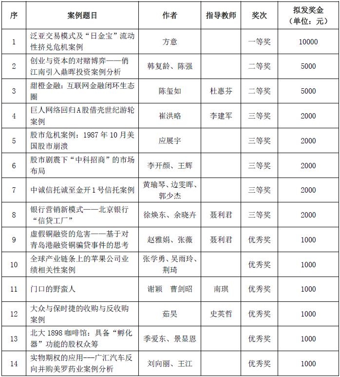 公司第三届金融硕士教学案例征文评奖活动自2015年11月6日启动以来,共收到案例作品14篇。经不端检测、匿名评阅、答辩评审等环节严格把关,最终评出一等奖1名,二等奖2名,三等奖5名,优秀奖6名。现将评奖结果公布给大家(见附表)。如有异议,请在4月20日上午10点前与公司研究生工作办公室联系,电话62289313,公示期五个工作日。