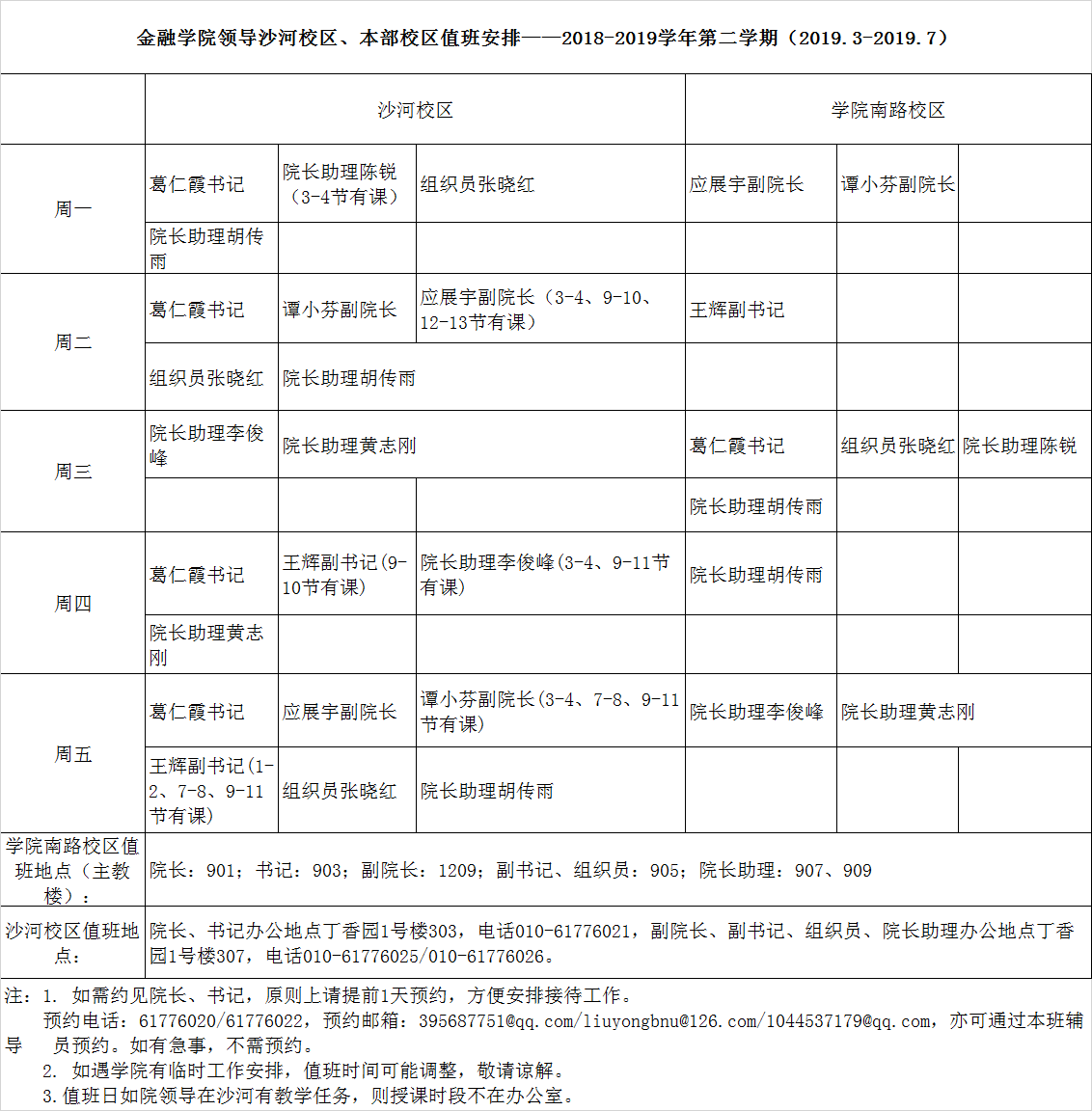太阳集团tyc539领导沙河校区、本部校区值班安排——2018-2019学年第二学期(2019.3-2019.7)