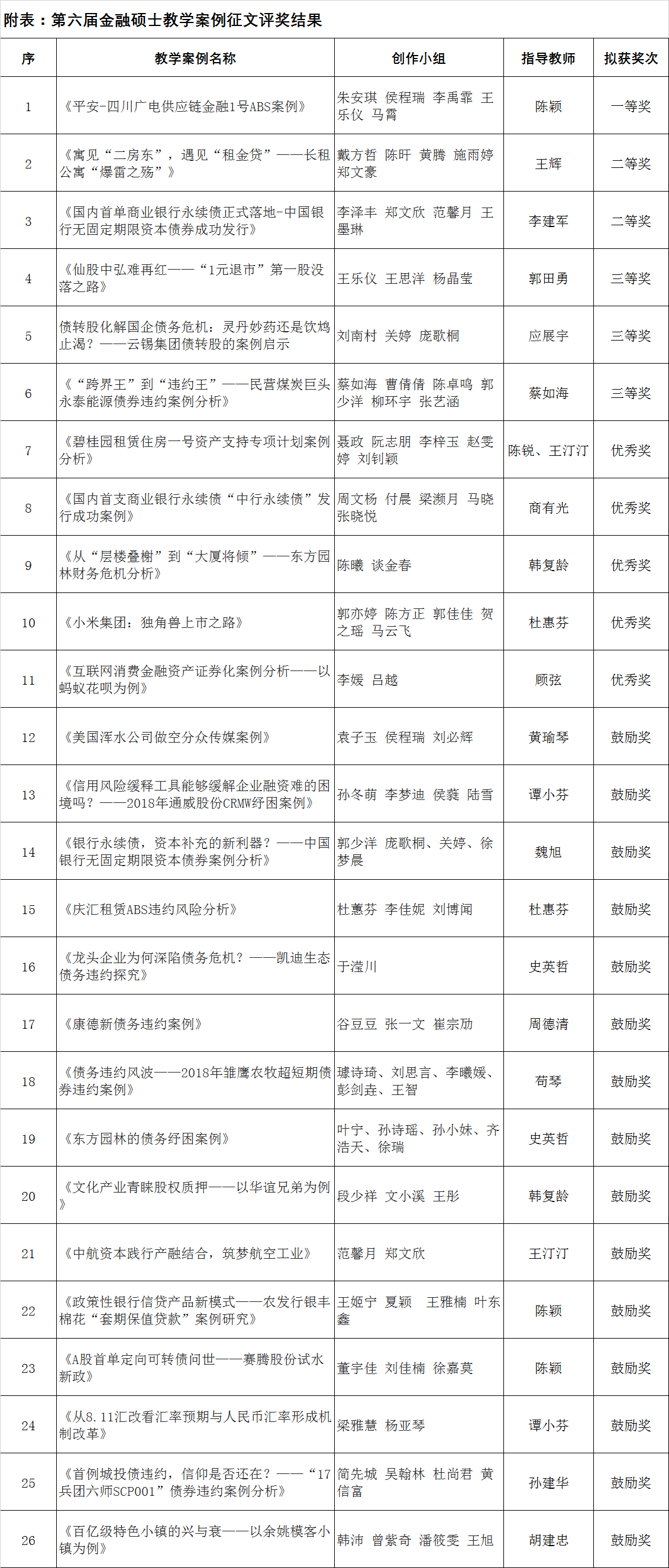 公司第六届金融硕士教学案例征文评奖活动自2018年12月6日启动以来,共收到案例作品27篇。经不端检测、匿名评阅、答辩评审等环节严格把关,最终评出一等奖1名,二等奖2名,三等奖3名,优秀奖5名,鼓励奖15名,其中优秀及以上奖次都进行了答辩评奖环节。现将评奖结果公布给大家(见附表)。如有异议,请在5月20日下午16点前与公司研究生工作办公室联系,电话62289313。